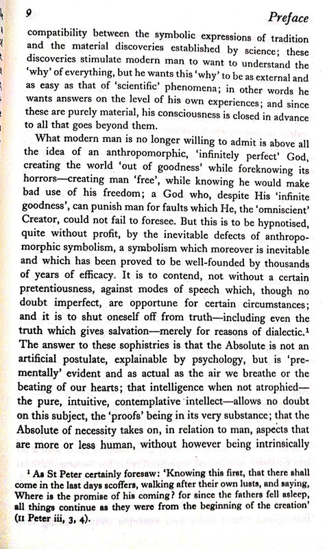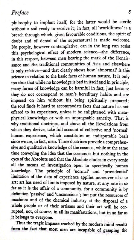 Schuon was considered as one of the very few Europeans qualified to give an authentic interpretation of Oriental doctrines and T. S. Eliot wrote of the first of M. Schuon’s books to appear in English that he had met no more impressive work in the field of the comparative study of Oriental and Occidental Religion.